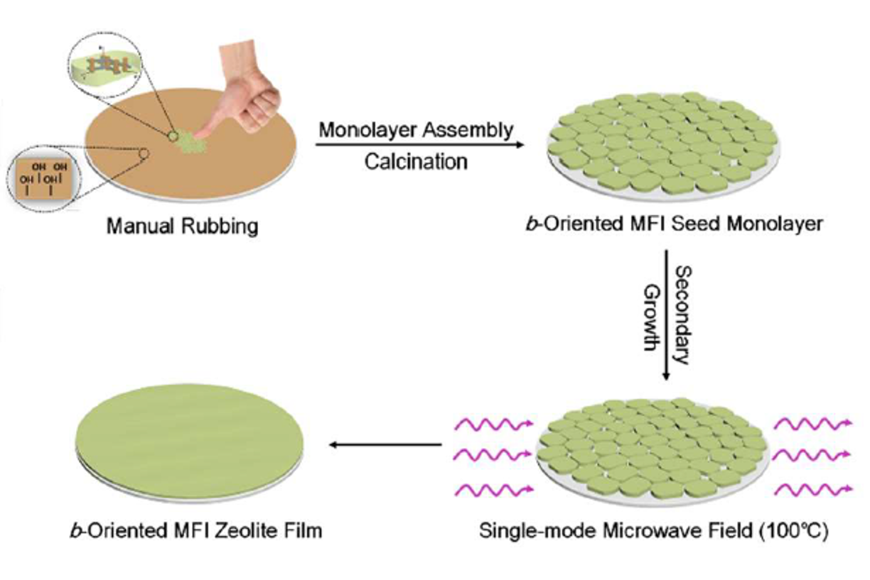 在该项工作中,刘毅教授课题组首次将单模微波辐射应用于b-轴取向MFI晶种层外延生长,在不高于100℃的温和反应条件下制备出连生性好、无孪晶且高度b-轴取向的MFI沸石分子筛膜,使得在敞口环境中简便、高效制备高质量b-轴取向MFI分子筛膜成为现实。同时,该研究成果为简便、高效调控分子筛膜微观结构提供了新思路。
