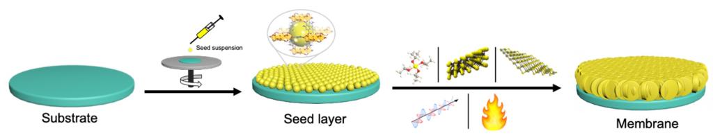 相较于热驱动的分离过程,膜分离过程可以大大的减少能源消耗,同时利用多孔结构的尺寸筛分效应可以实现工业上难以分离的组分的精准筛分。其中金属有机骨架膜材料因其结构稳定可调等特点在气体分离过程中表现出巨大的潜力。NH2-MIL-125因其适当的孔径和结构中的氨基官能团对于CO2的选择性吸附作用,良好的化学稳定性等特点,被广泛应用于CO2的分离和捕获过程。大量研究表明金属有机骨架膜的微观结构包括晶体取向,晶界缺陷等对其分离性能有重要影响。然而受限于单一的钛金属源以及有限的制备方法,迄今为止对NH2-MIL-125膜的微结构优化的研究还鲜有报道