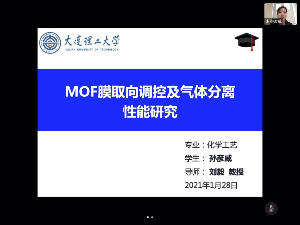 2021年1月28日9时,先进分子筛膜材料课题组17级博士研究生孙彦威的毕业答辩在腾讯会议顺利举行。张艳老师任答辩委员会秘书,答辩委员会由大连化物所杨维慎研究员、朱雪峰研究员、浙江大学王正宝教授、大连理工大学郭新闻教授、张雄福教授、杨建华教授组成,其中杨维慎研究员担任答辩委员会主席。